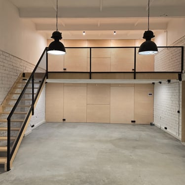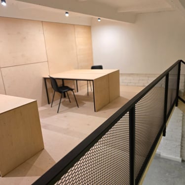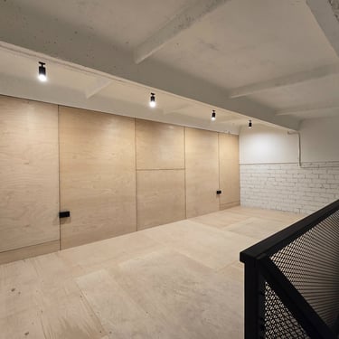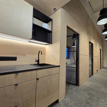 Naujoms patalpoms kurti pasirinkome minimalias priemones - betoną, medžio faneros gaminius ir būtiniausius inžinerinių sitemų atributus.